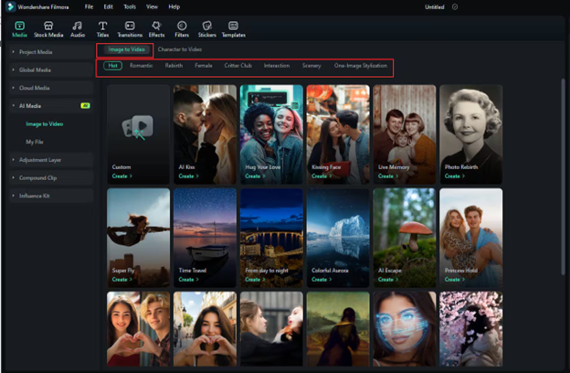 Ci sono centinaia di modelli per realizzare video dalle immagini. È necessario selezionare un modello e caricare la tua foto per applicare quell'effetto. Seleziona l'opzione modello personalizzato e inserisci un prompt di testo dettagliato per realizzare un video dall'immagine.