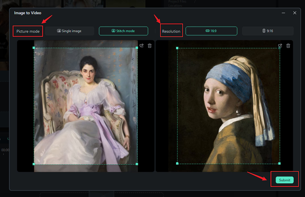 Scegli 9:16 (ritratto) per la dimensione ideale della bobina dei social media. Successivamente, scegli tra la modalità singola immagine o punto e fai clic su Invia una volta impostata le tue preferenze.