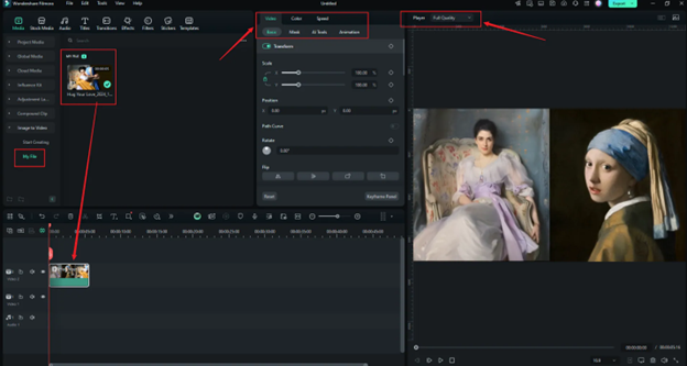 Trova il tuo video generato nella sezione «My Files». Trascinalo alla sequenza temporale e aggiungi testo, effetti audio o regola i tempi.